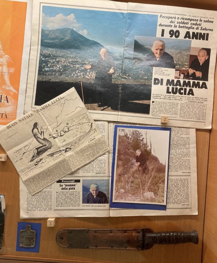 “Umanità” è proprio la parola chiave che rappresenta a pieno la figura di Mamma Lucia. Lei è ricordata per questa caratteristica , poichè ha ridato un nome e una degna sepoltura a più di 700 caduti, tedeschi per la maggior parte, italiani e inglesi della seconda guerra mondiale. Tutto inizia nel 1946, nell’immediato dopoguerra, quando Mamma Lucia fa un sogno che segnerà la sua vita: otto soldati che escono dalle loro tombe e la pregano di essere riportati dalle loro madri. Il giorno seguente, ella si reca sul luogo del sogno e trova effettivamente i resti di otto soldati. Da quel giorno ha continuato imperterrita nella sua impresa, fino a ricevere medaglie ed elogi non solo da parte dell’Italia, ma anche dalla Germania, che voleva offrirle una pensione tedesca, che lei rifiutò, perché aveva fatto tutto esclusivamente per amore.