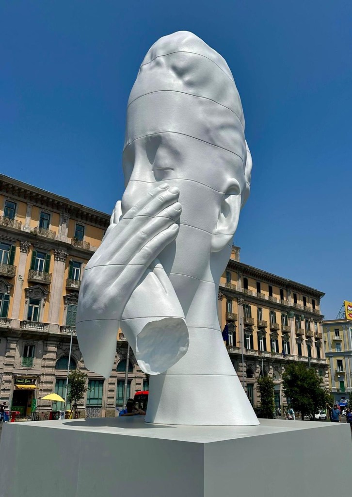 A pochi passi dal Duomo, un’altra presenza silenziosa veglia sulla città: Silent Hortense, la monumentale scultura di Jaume Plensa in Piazza Municipio. Alta quasi nove metri, è una figura femminile senza tempo, modellata con tecnologie contemporanee ma intrisa di un’aura arcaica. Le mani le coprono parzialmente il volto, evocando mistero e raccoglimento. È una divinità laica, muta e potente, che non comunica per parole ma per presenza. In un’epoca sovraccarica di dati, immagini e rumori, la sua immobile purezza diventa gesto politico: non rinuncia al mondo, ma lo osserva con una silenziosa urgenza.
