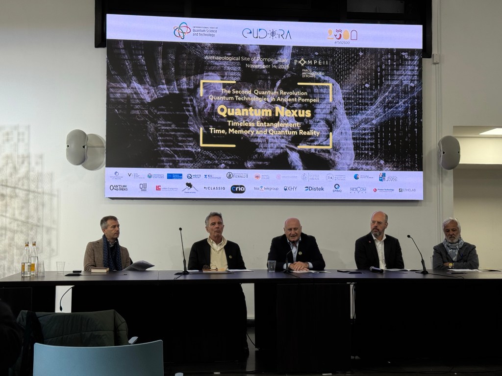 Pompei, 14 novembre 2025 – Nella cornice unica dell’Auditorium del Parco Archeologico di Pompei si è svolto “Quantum Nexus – Timeless Entanglement”, uno degli eventi conclusivi dell’Anno Internazionale delle Tecnologie Quantistiche, organizzato dall’Associazione Eudora in collaborazione con il Parco Archeologico. L’iniziativa ha messo in dialogo scienza, storia e filosofia, scegliendo Pompei come luogo simbolico in cui il passato sospeso nel tempo incontra la rivoluzione quantistica del presente.